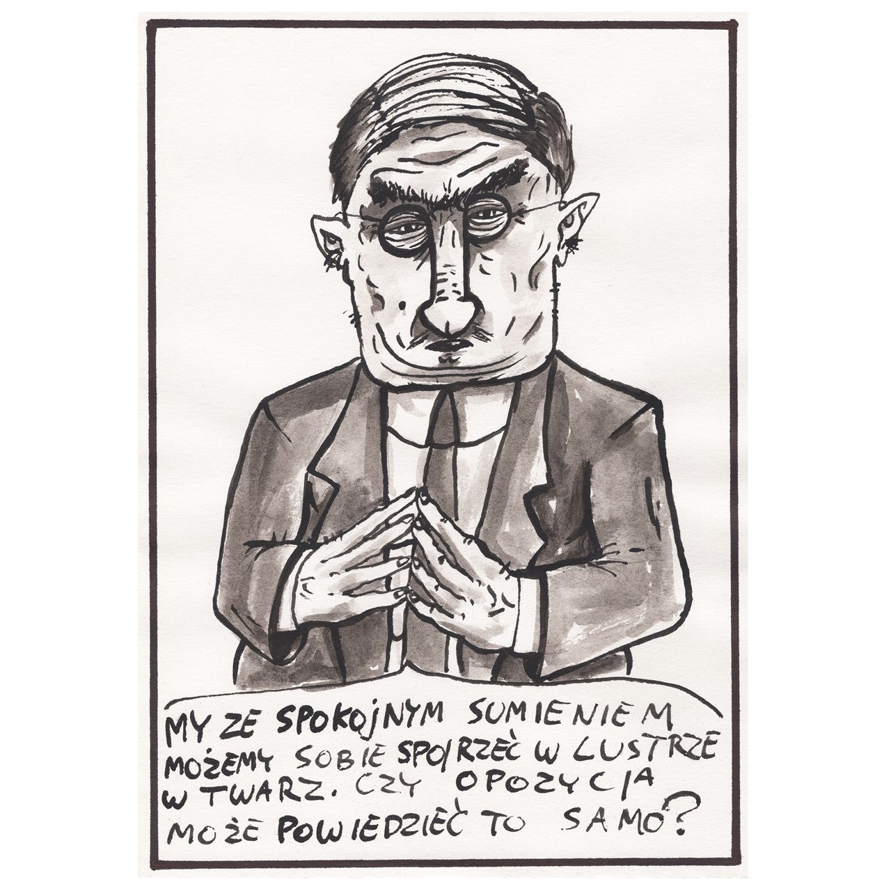 An original satirical drawing available as a one-of-a-kind original or as a high-quality fine art print.