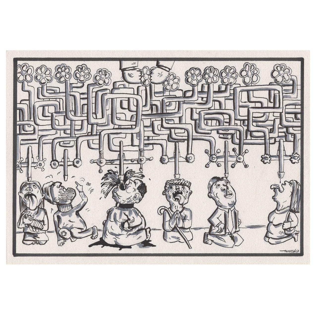 An original satirical drawing available as a one-of-a-kind original or as a high-quality fine art print.
