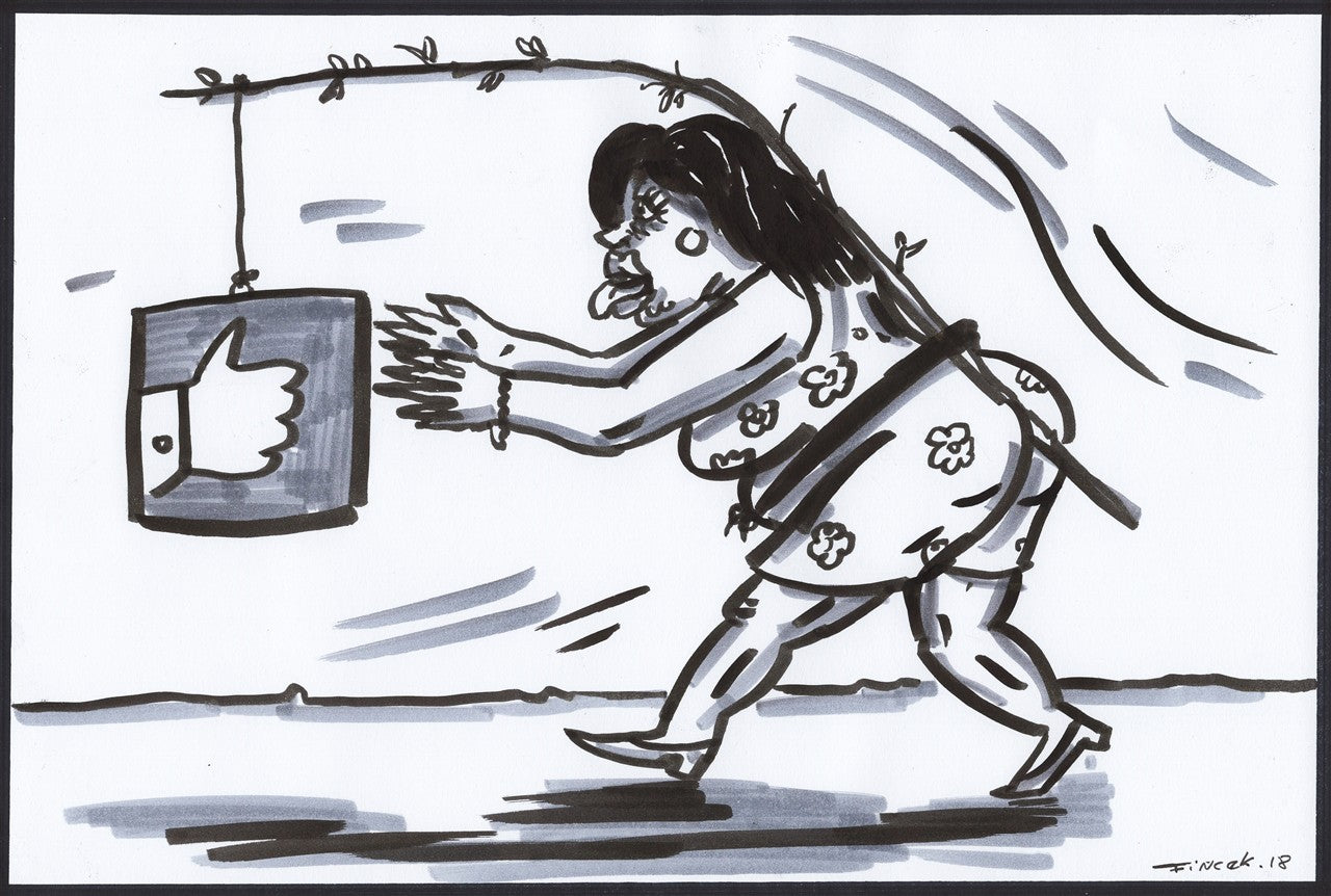 An original satirical drawing available as a one-of-a-kind original or as a high-quality fine art print.