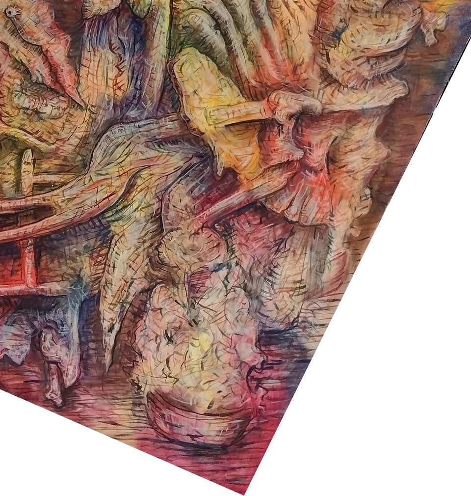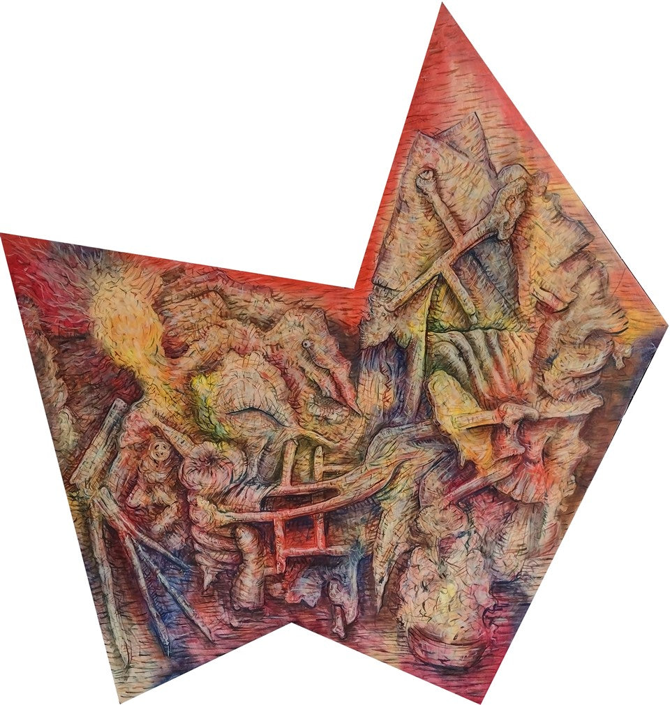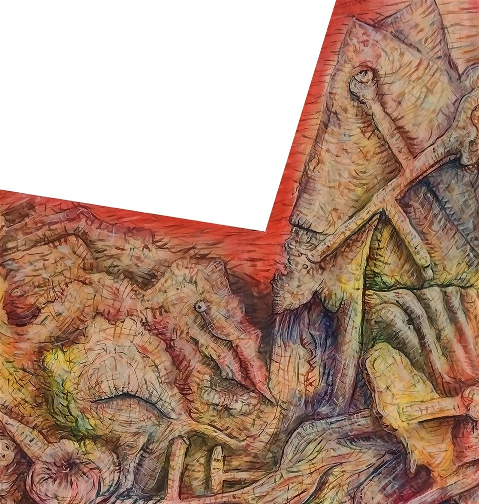 A surrealistic depiction that addresses the collective subconscious of events and the state of humanity at this moment in time and the direction we are headed as a humanity and civilization.