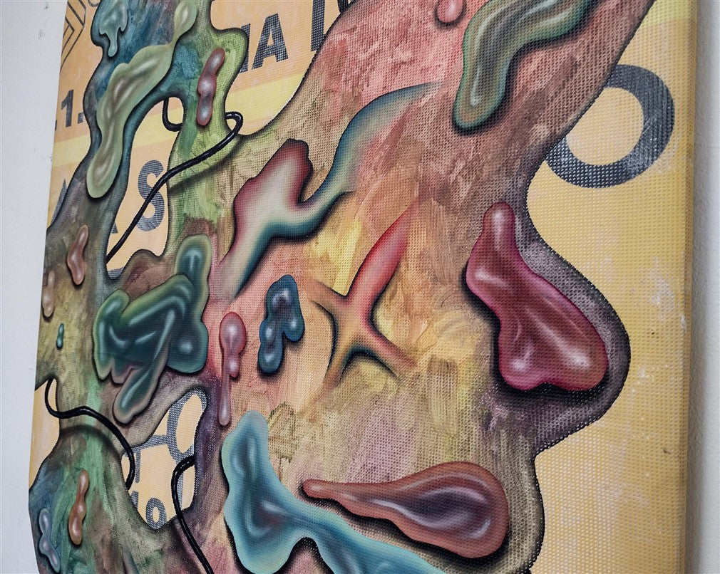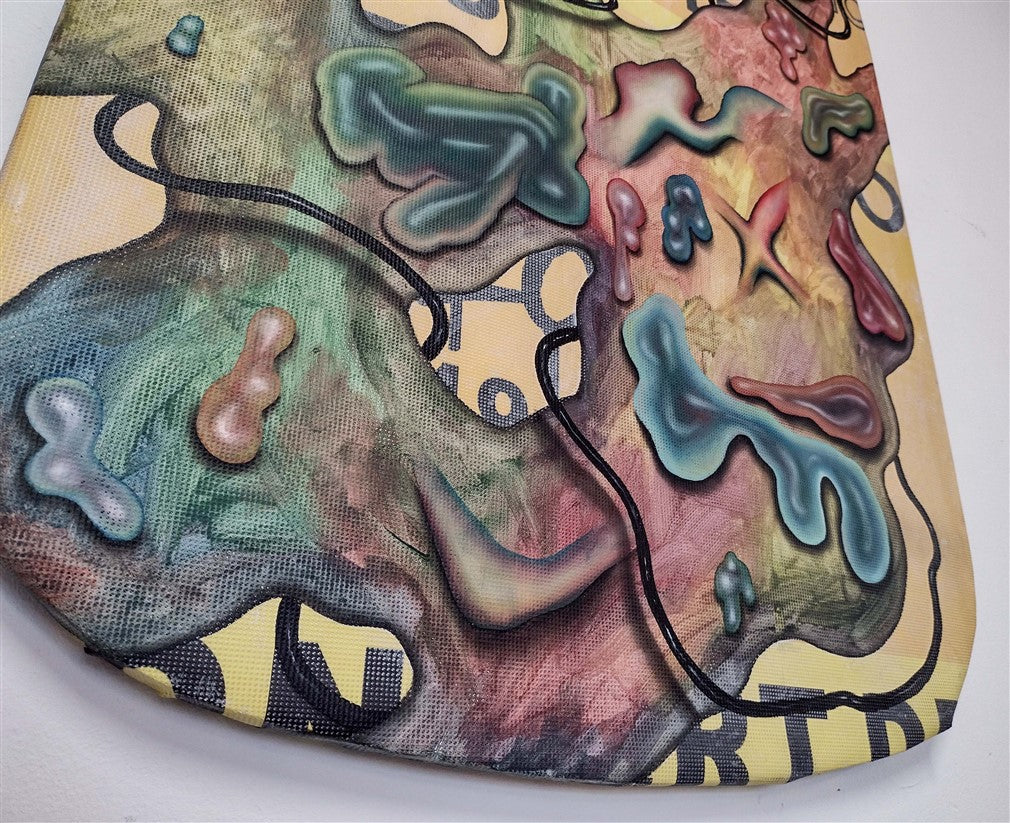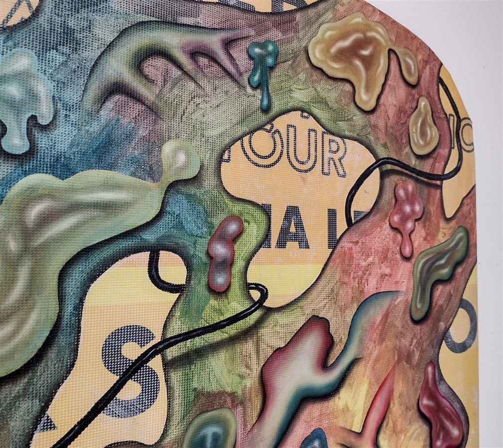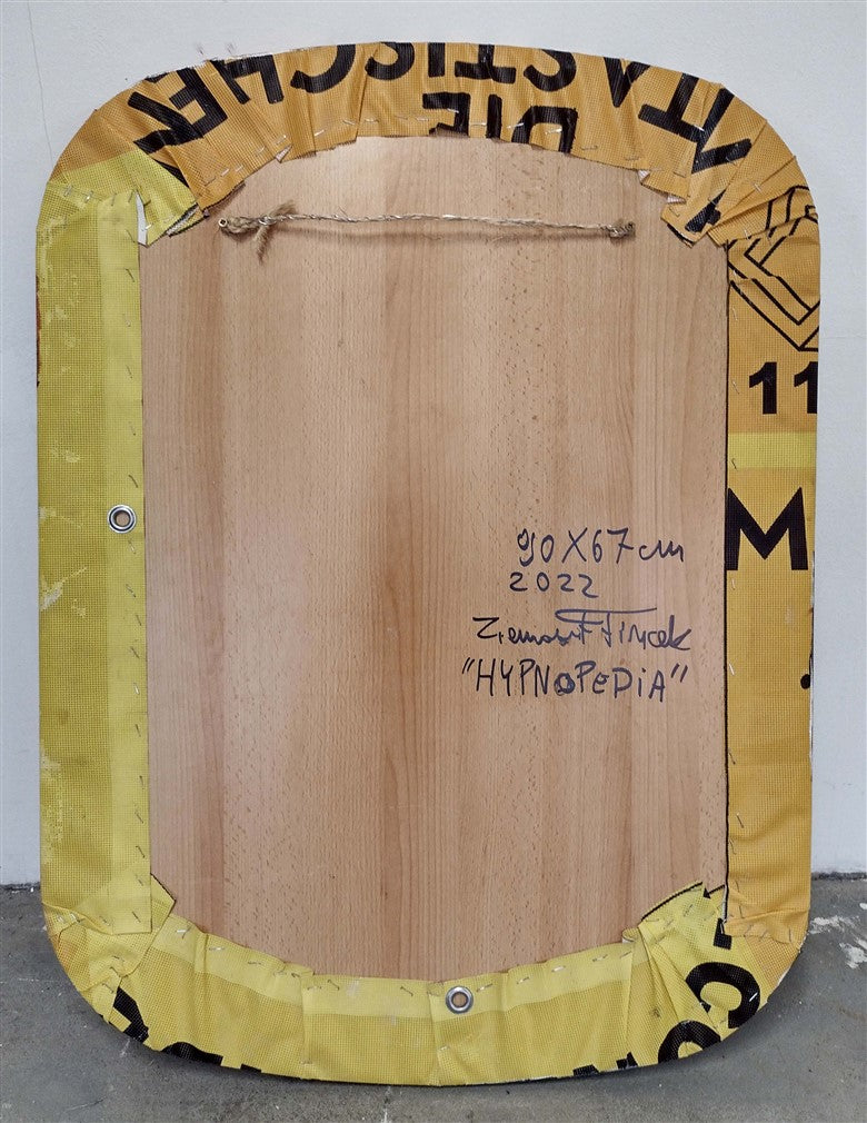 67 W x 90 H x 3 D centimeters. Oil and acrylic on banner on board.