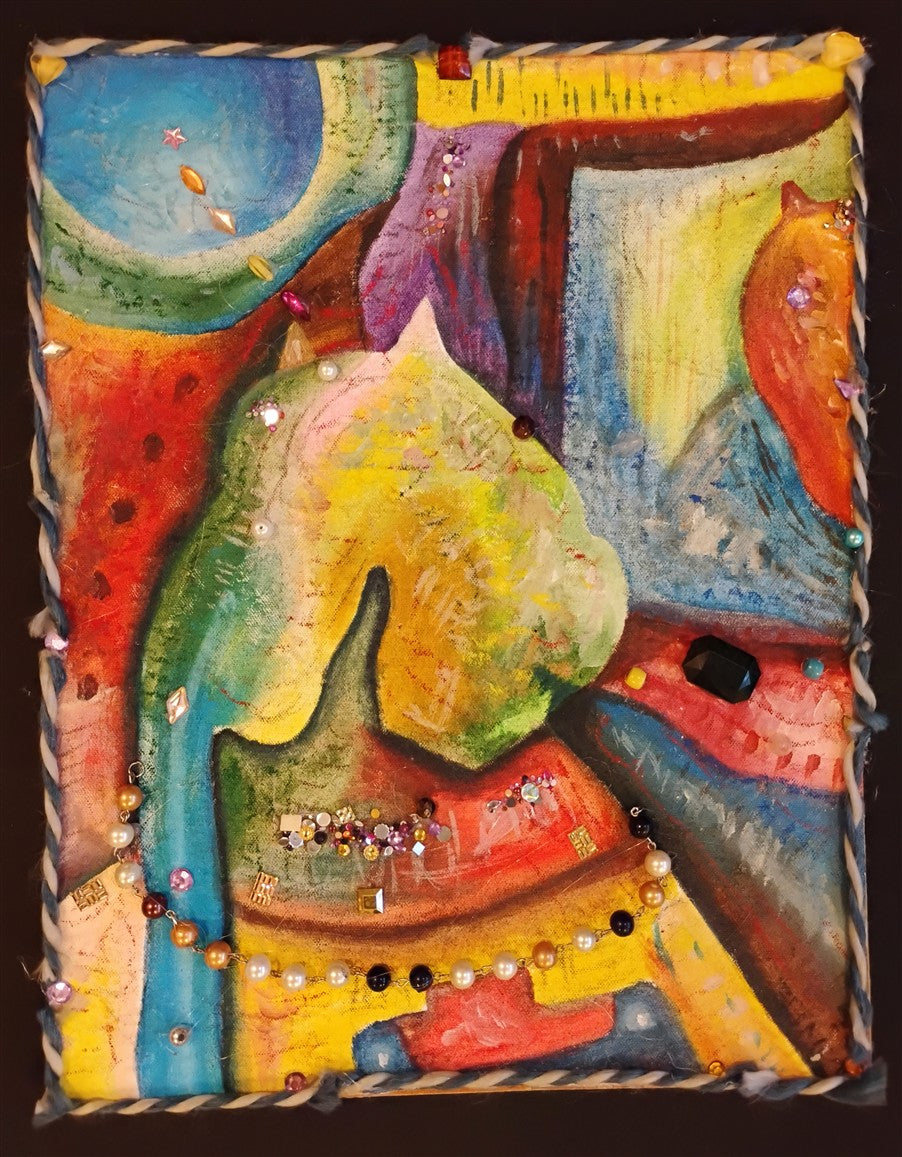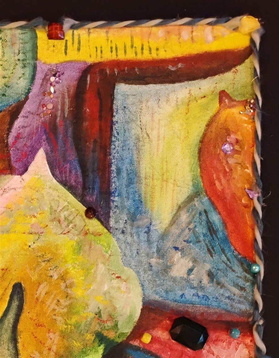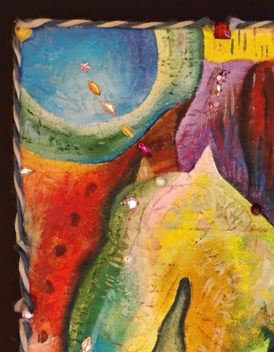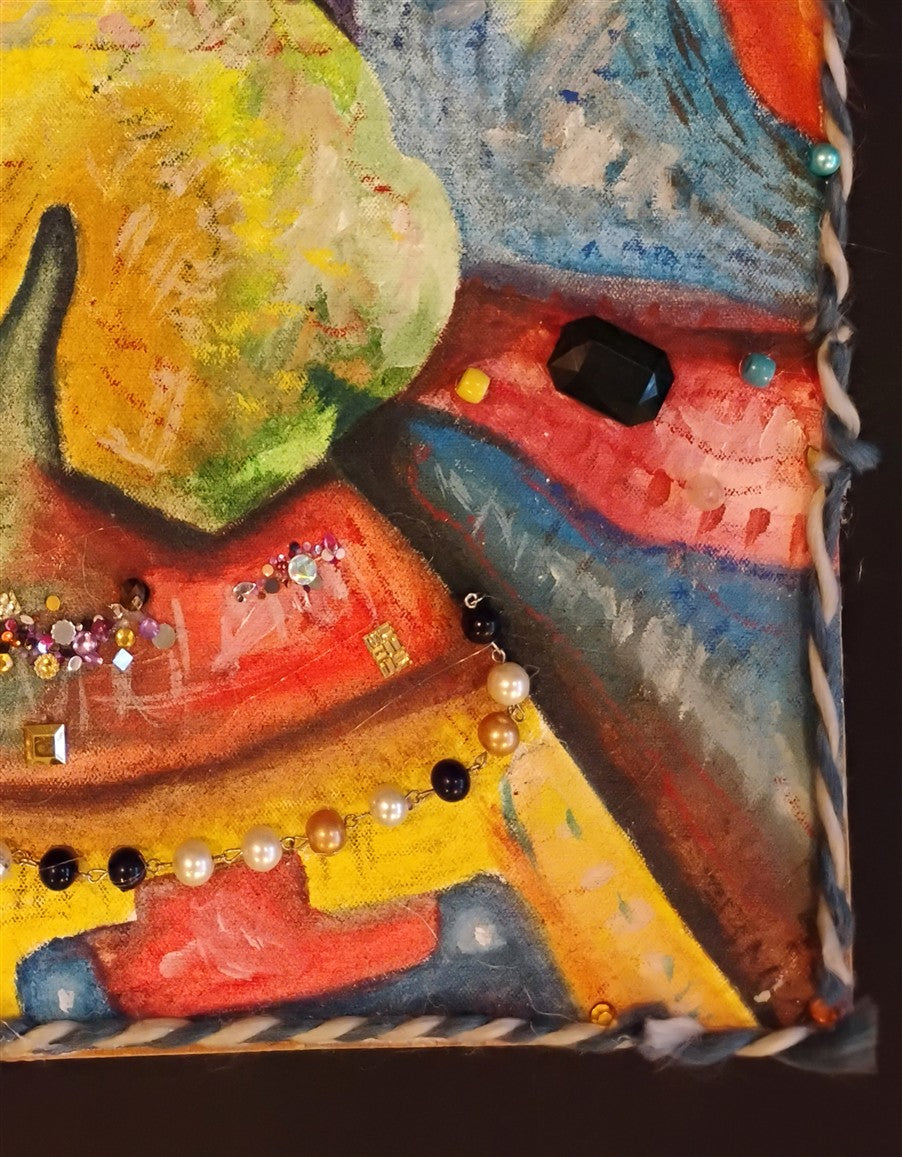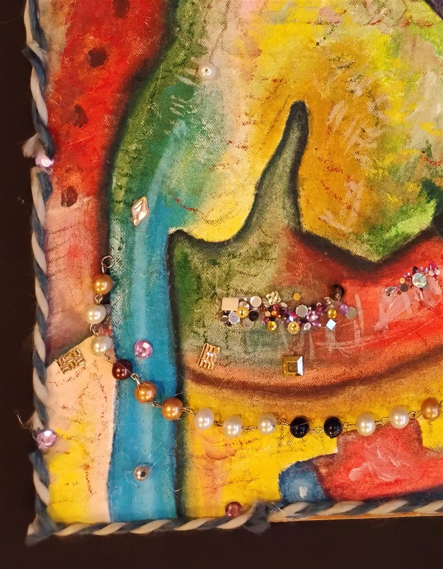 Acylics on canvas, on board, wool, faux diamonds.