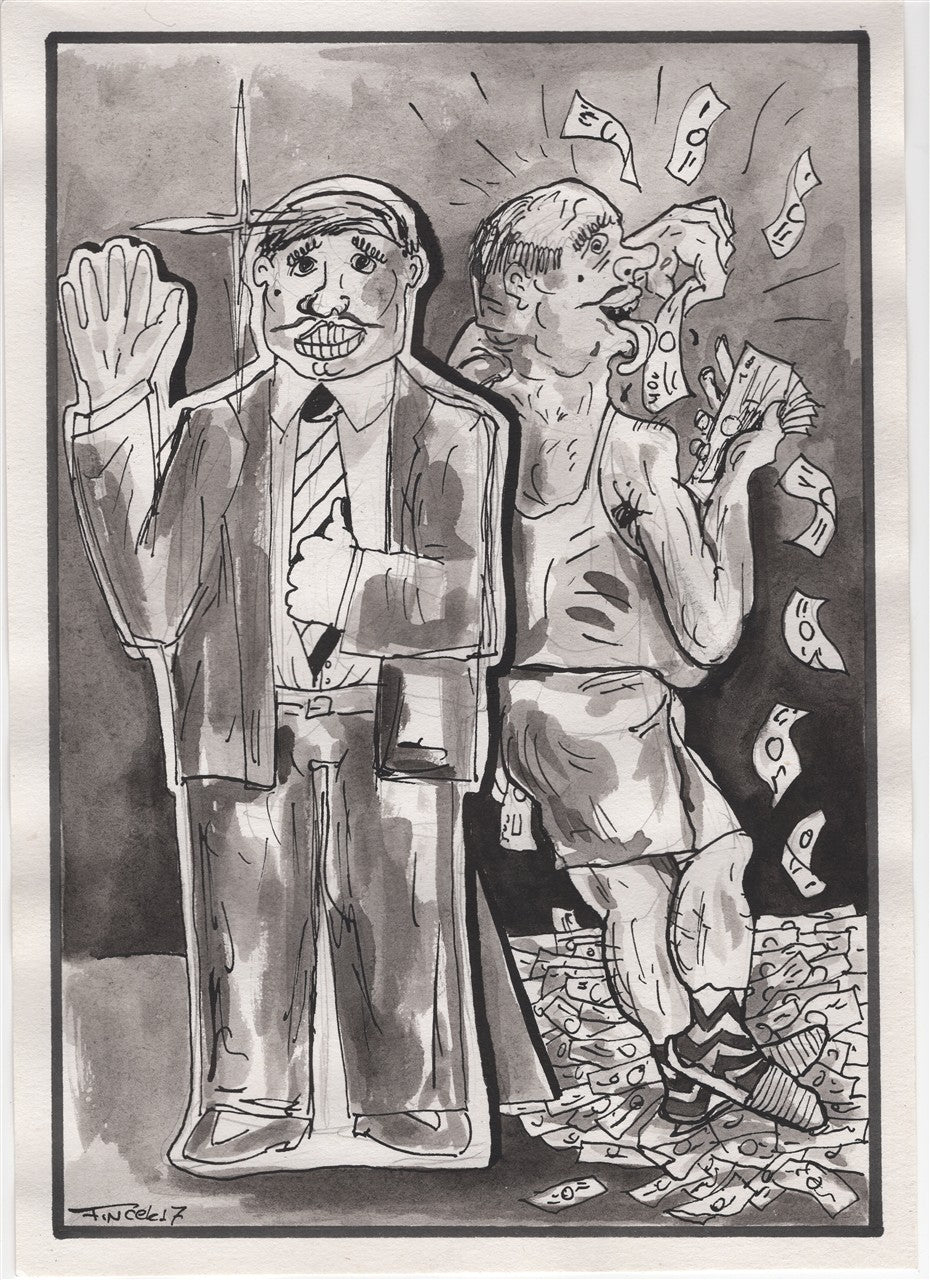 An original satirical drawing available as a one-of-a-kind original or as a high-quality fine art print.
