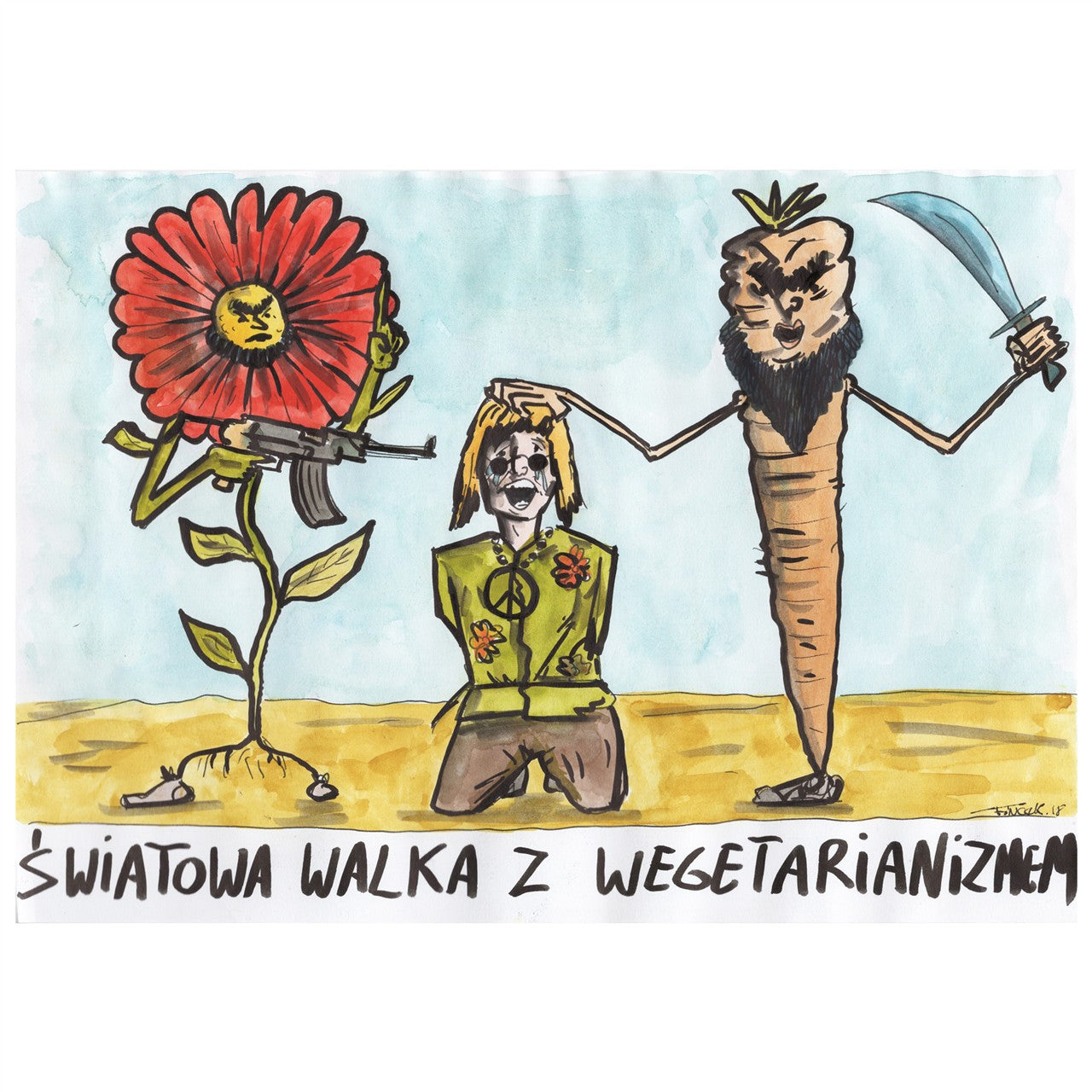An original satirical drawing available as a one-of-a-kind original or as a high-quality fine art print.